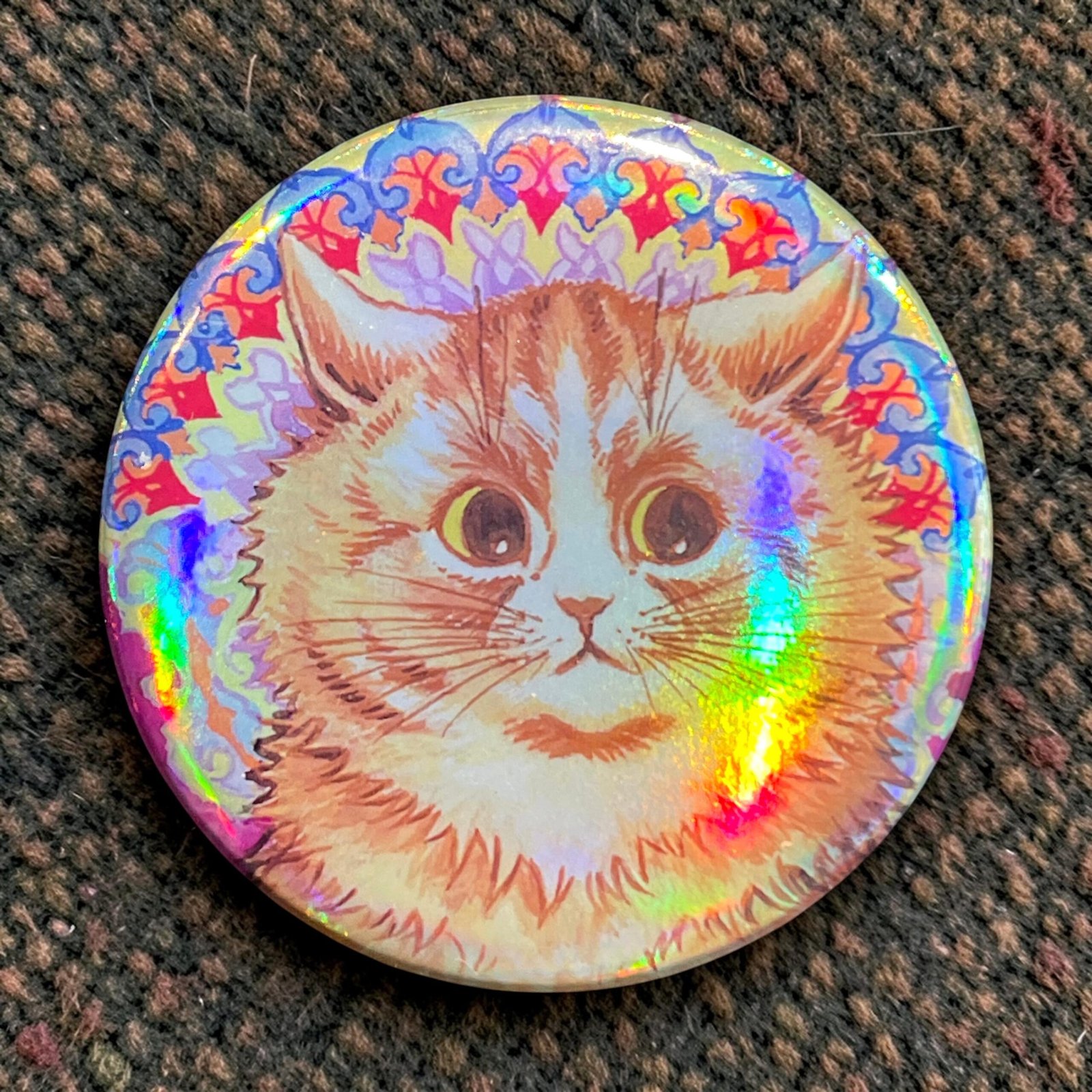Ce badge met à l’honneur l’une de ses œuvres au style intensément coloré, kitsch et psychédélique, représentative de l’évolution fascinante de son langage visuel. Avec ses motifs complexes et ses teintes multicolores, l’image oscille entre figuration et abstraction, donnant naissance à une esthétique hypnotique devenue emblématique de son travail.