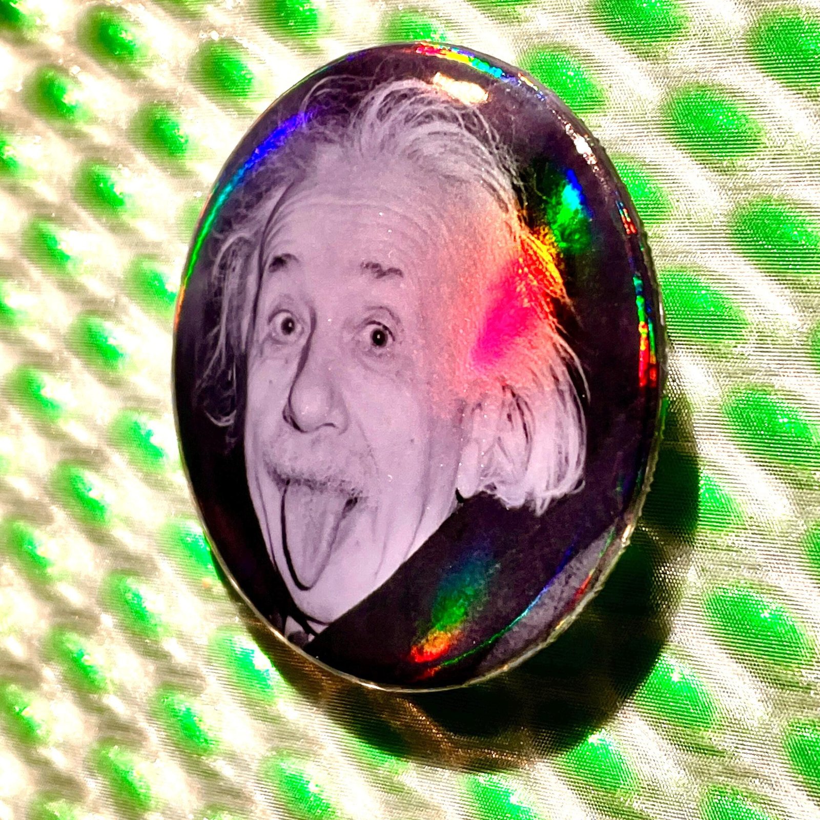 Selon la lumière, le badge révèle des nuances métalliques et arc-en-ciel qui contrastent avec le noir et blanc original, donnant une nouvelle lecture visuelle à ce portrait culte.