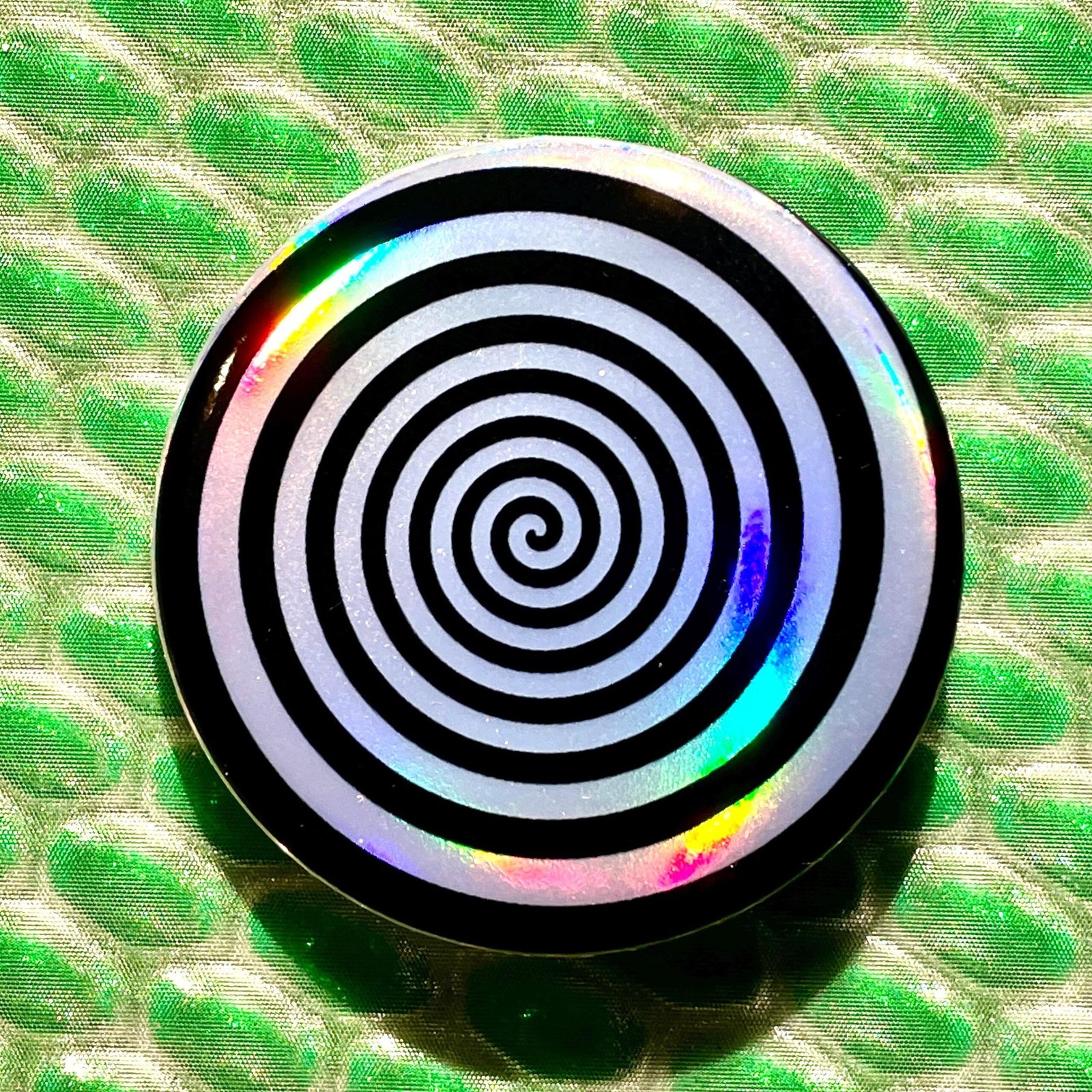 Badge Spirale Hypnotique Noire aux Reflets Holographiques – Tourbillon Op Art – 44 mm – Design Psychédélique – Fait Main