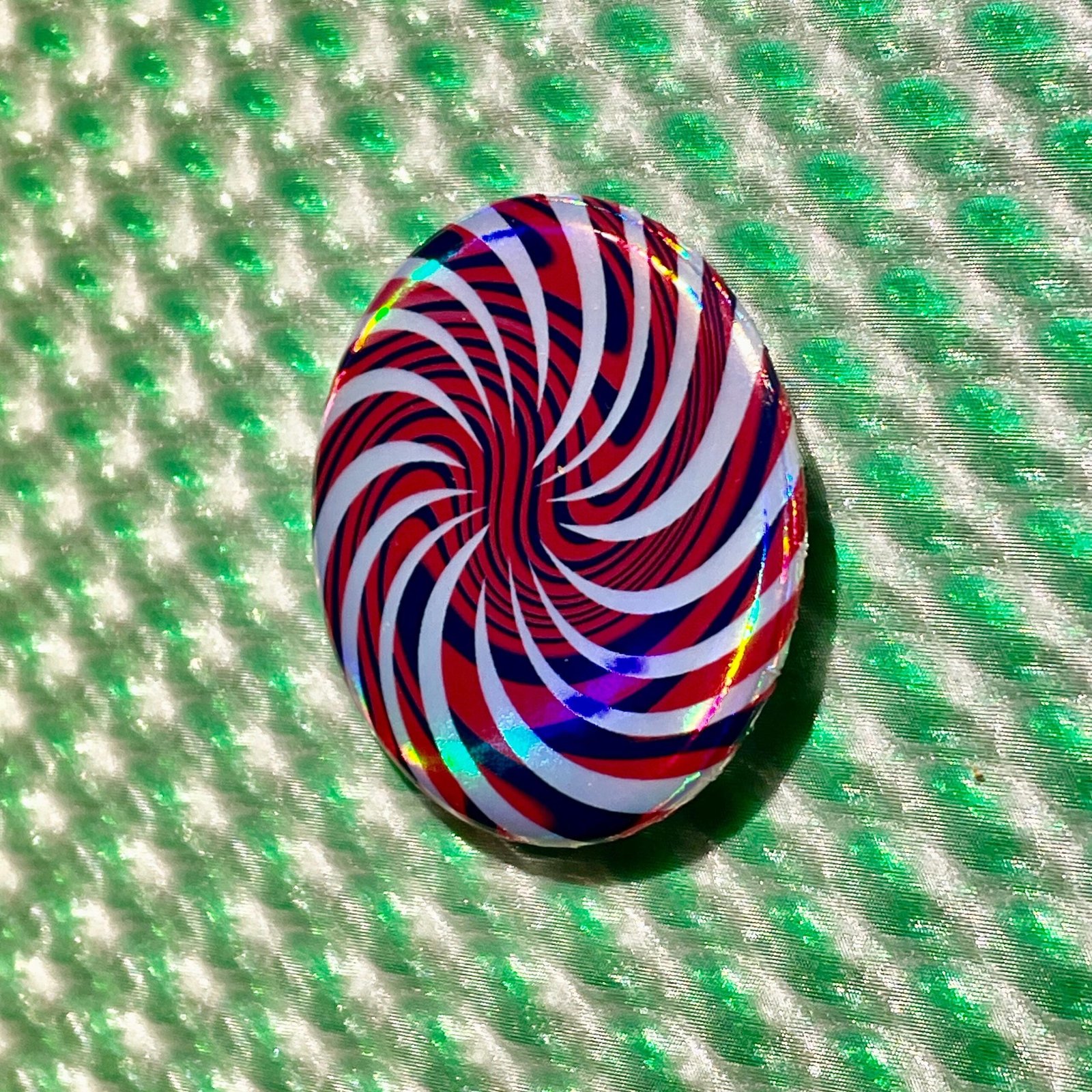 Le visuel est imprimé sur vinyle holographique aux reflets iridescents, ce qui ajoute des variations lumineuses changeantes qui renforcent l’effet optique et donnent encore plus de profondeur à la spirale.