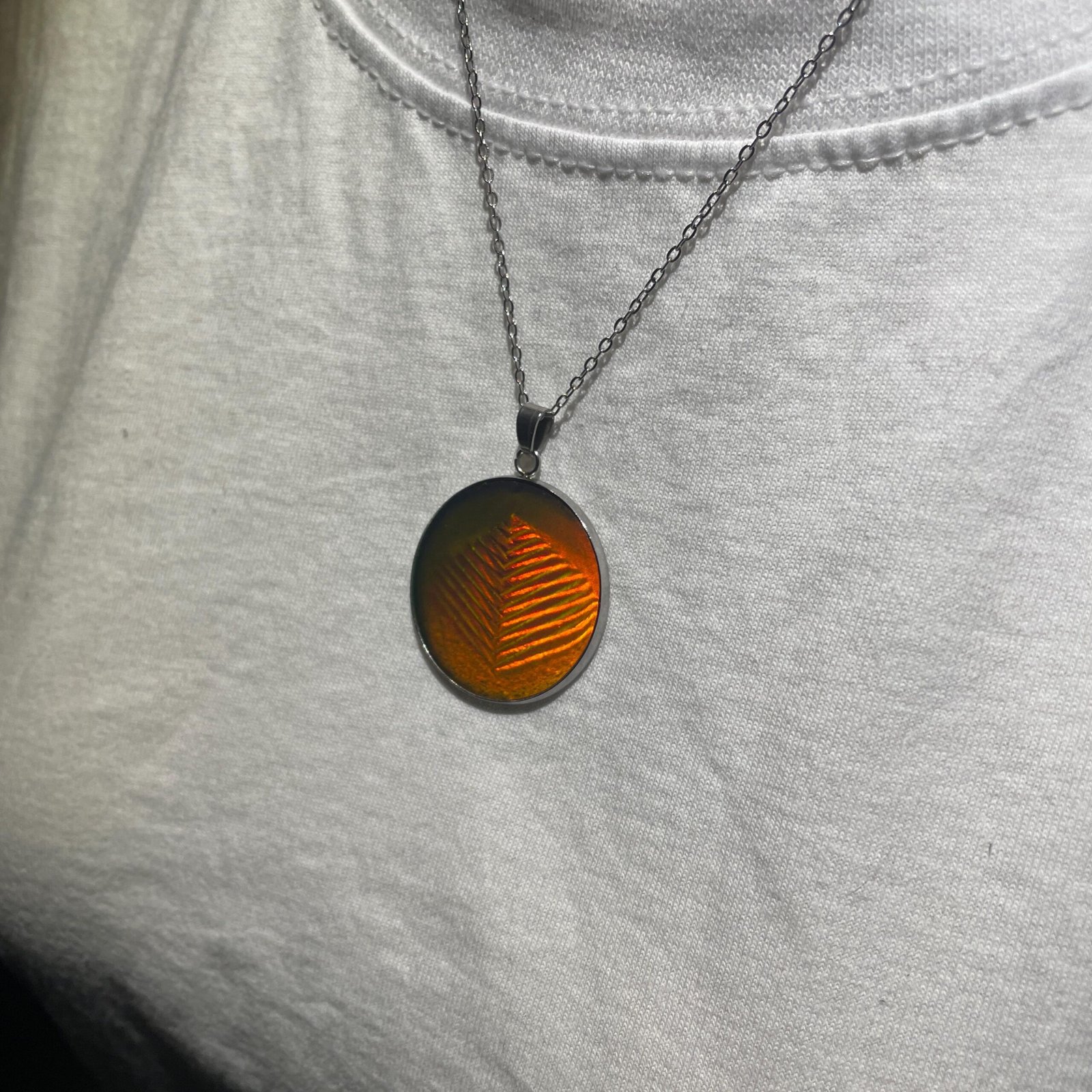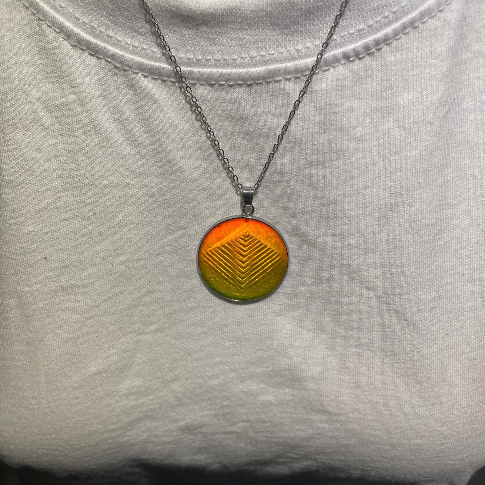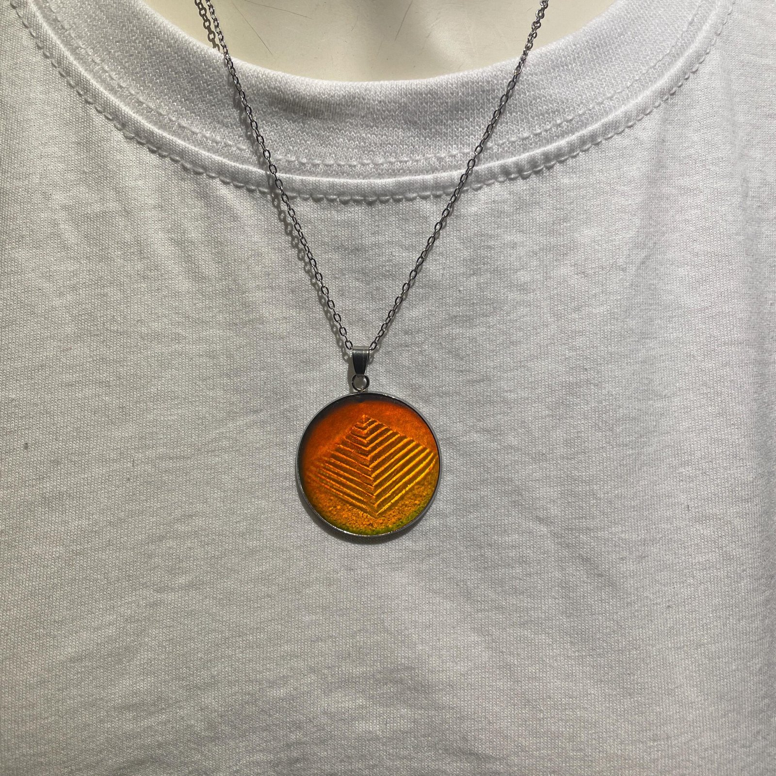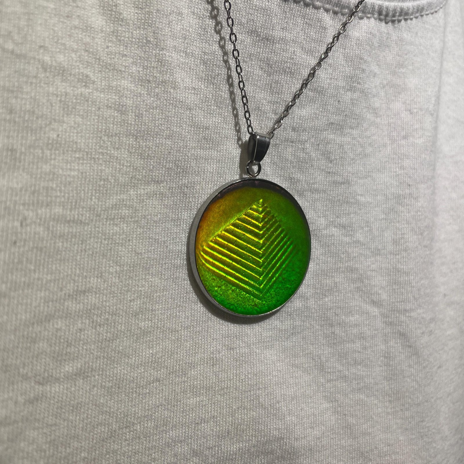 Pendentif de 30 mm de diamètre et chaine en acier inoxydable de 45cm assemblé par mes soins avec en inclusion un véritable hologramme 3D en photopolymère d’une pyramide produit dans les années 90 par la société américaine Krystal holographics.