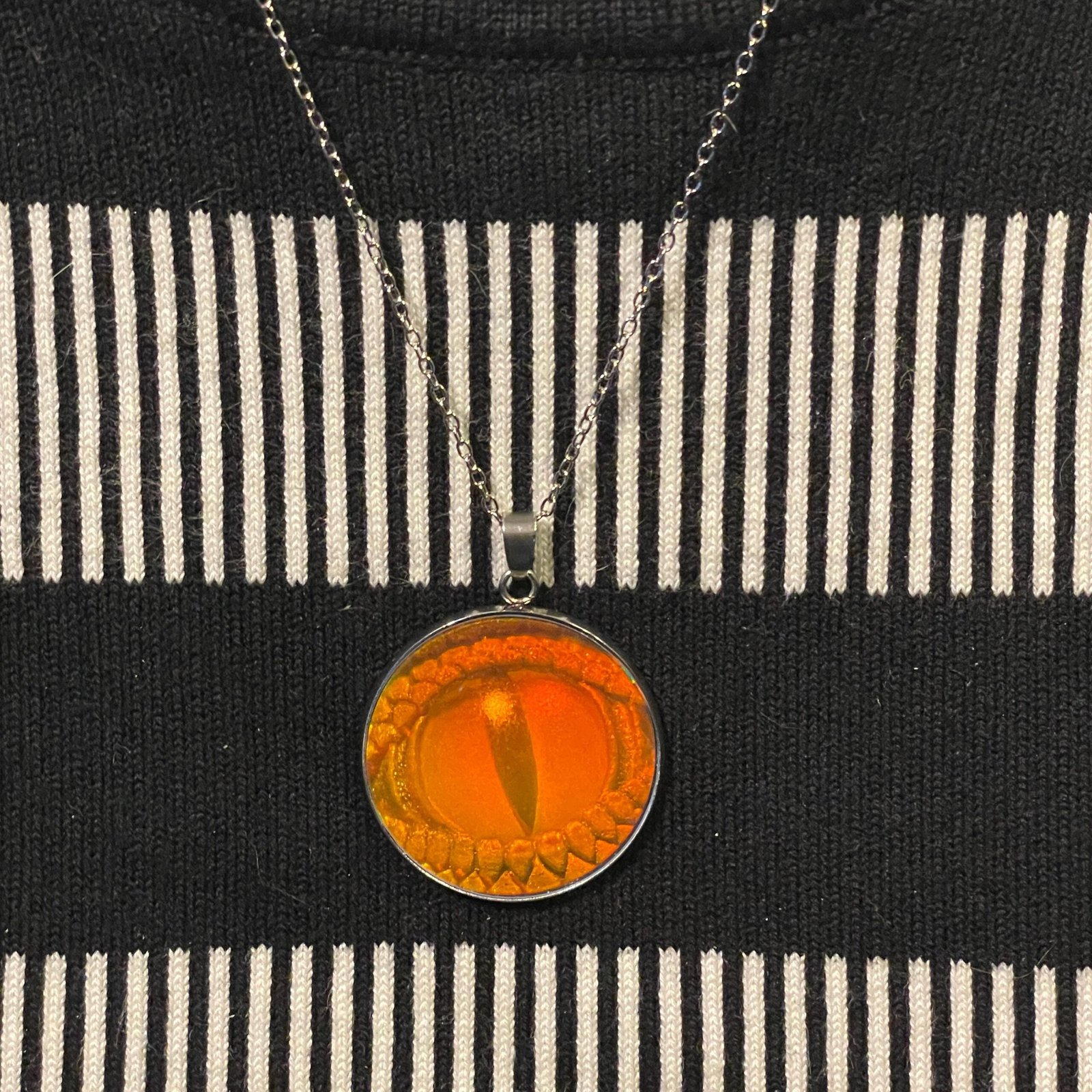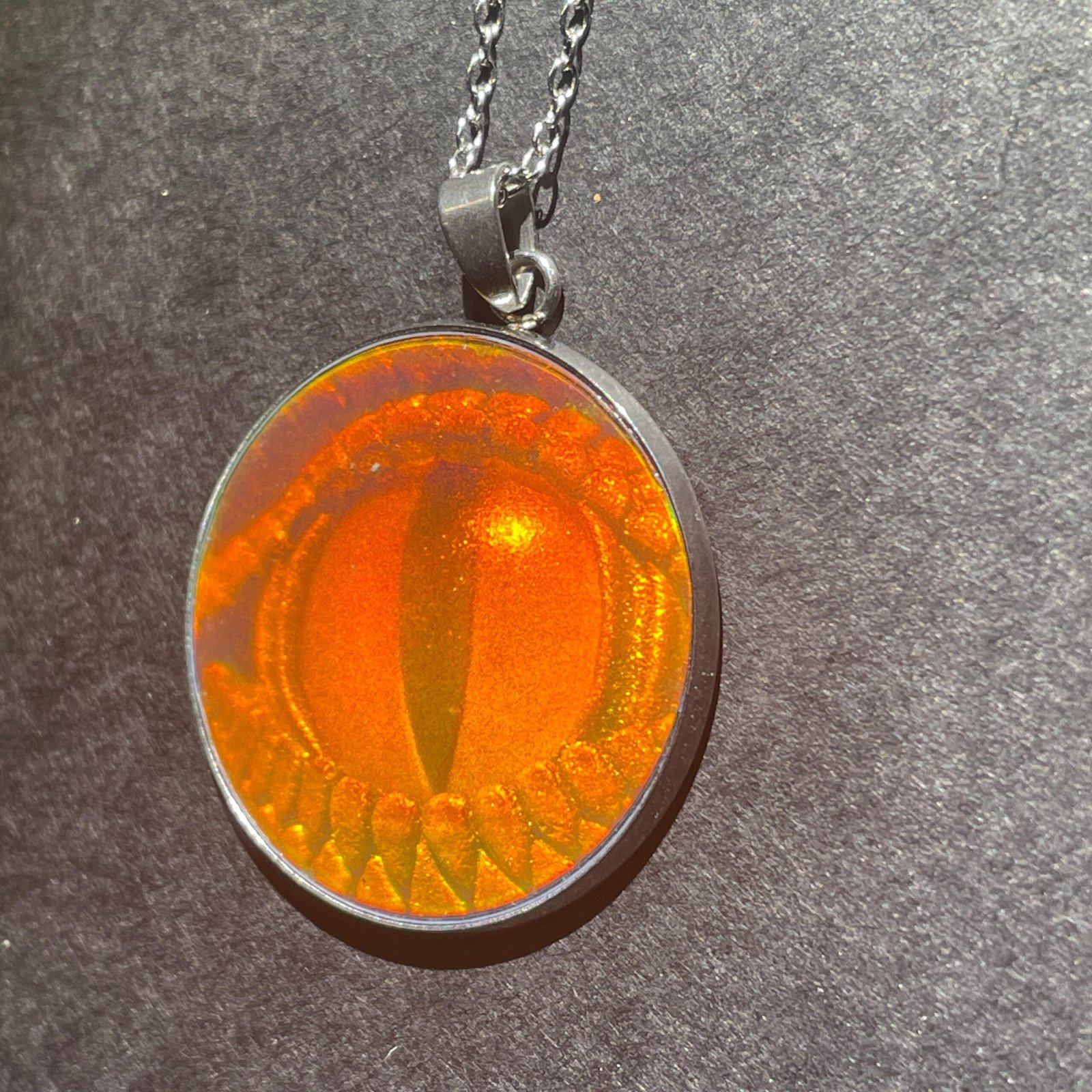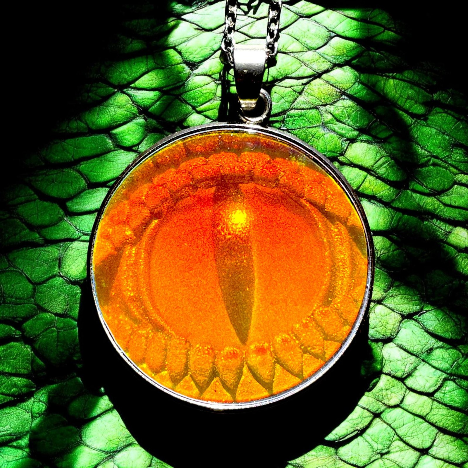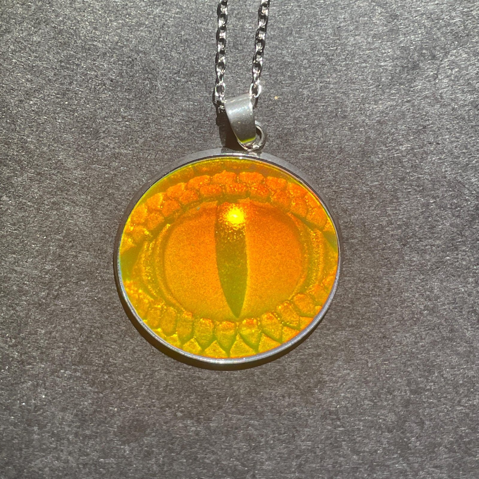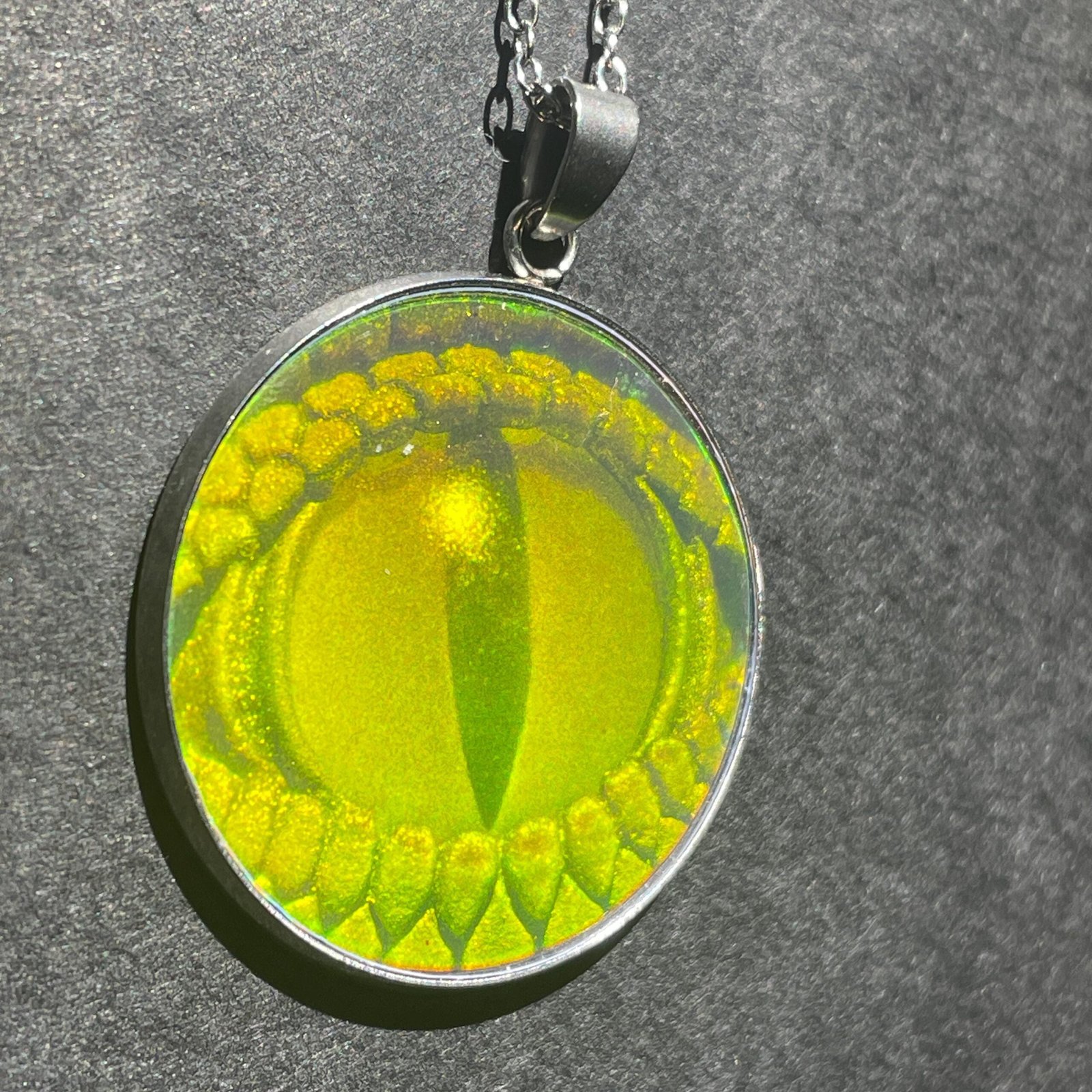 Ce pendentif de 30 mm de diamètre et chaine en acier inoxydable de 45cm assemblé par mes soins avec en inclusion un véritable hologramme 3D en photopolymère d’un œil de reptile en 3D.