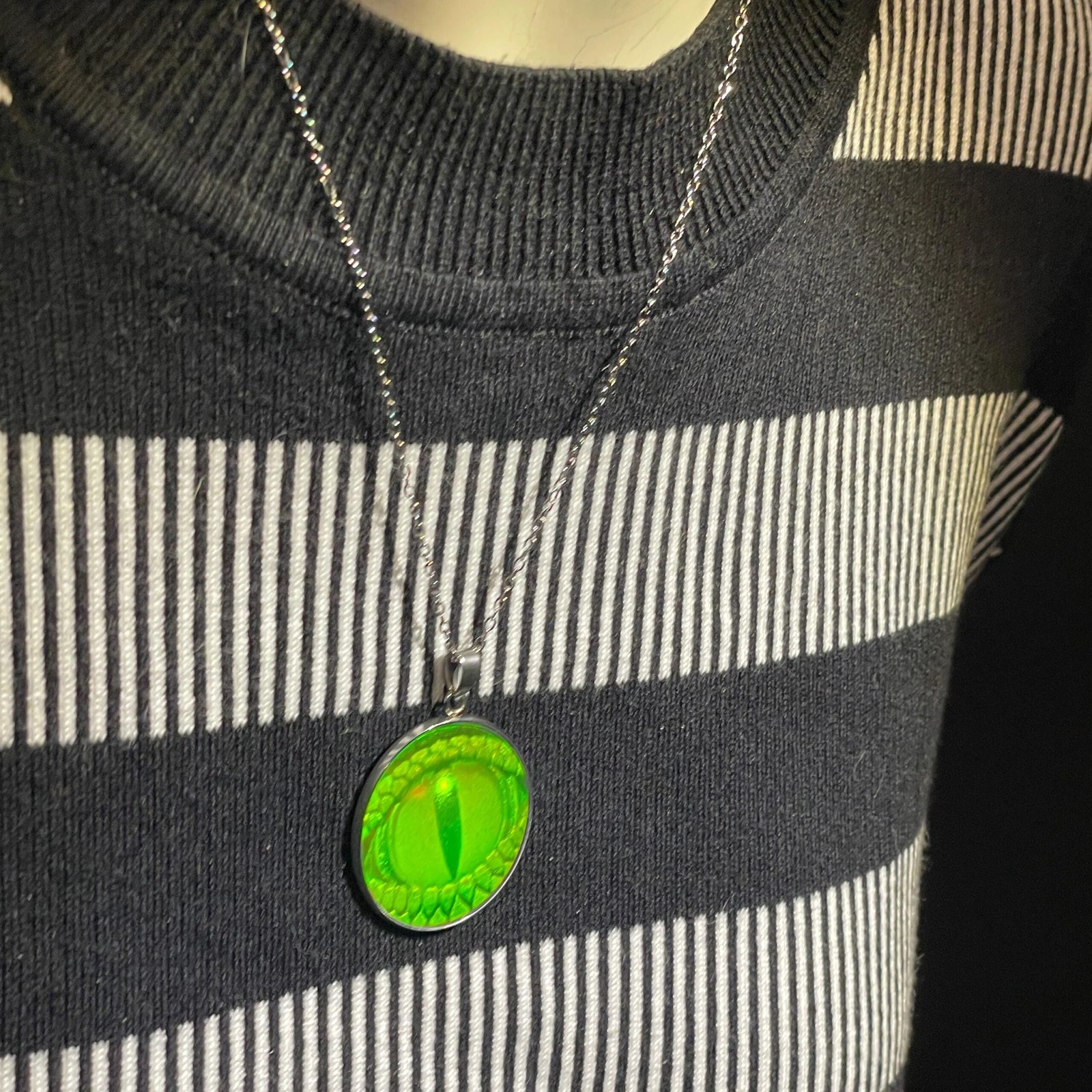 Ce pendentif rare renferme un hologramme 3D des années 90 représentant un œil de lézard réaliste, conçu par la société américaine Krystal Holographics. Sous différents angles, l’œil semble bouger et suivre le regard, créant un effet hypnotique et captivant.